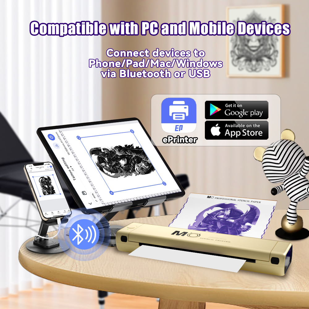 Introducing the MO Wireless Tattoo Stencil Printer, a revolutionary device designed to elevate your tattoo artistry with cutting-edge technology. This tattoo printer is equipped with Bluetooth connectivity, allowing for effortless, cable-free transfers from your smartphone, tablet, or PC. Say goodbye to cumbersome wires and hello to a streamlined workflow that enhances your creative process. As one of the leading thermal printer suppliers, we ensure that our tattoo thermal printer delivers high-quality, precise stencil prints every time. Whether you're working in a bustling studio or a quiet home setting, this portable thermal printer adapts to your needs, providing flexibility and convenience.